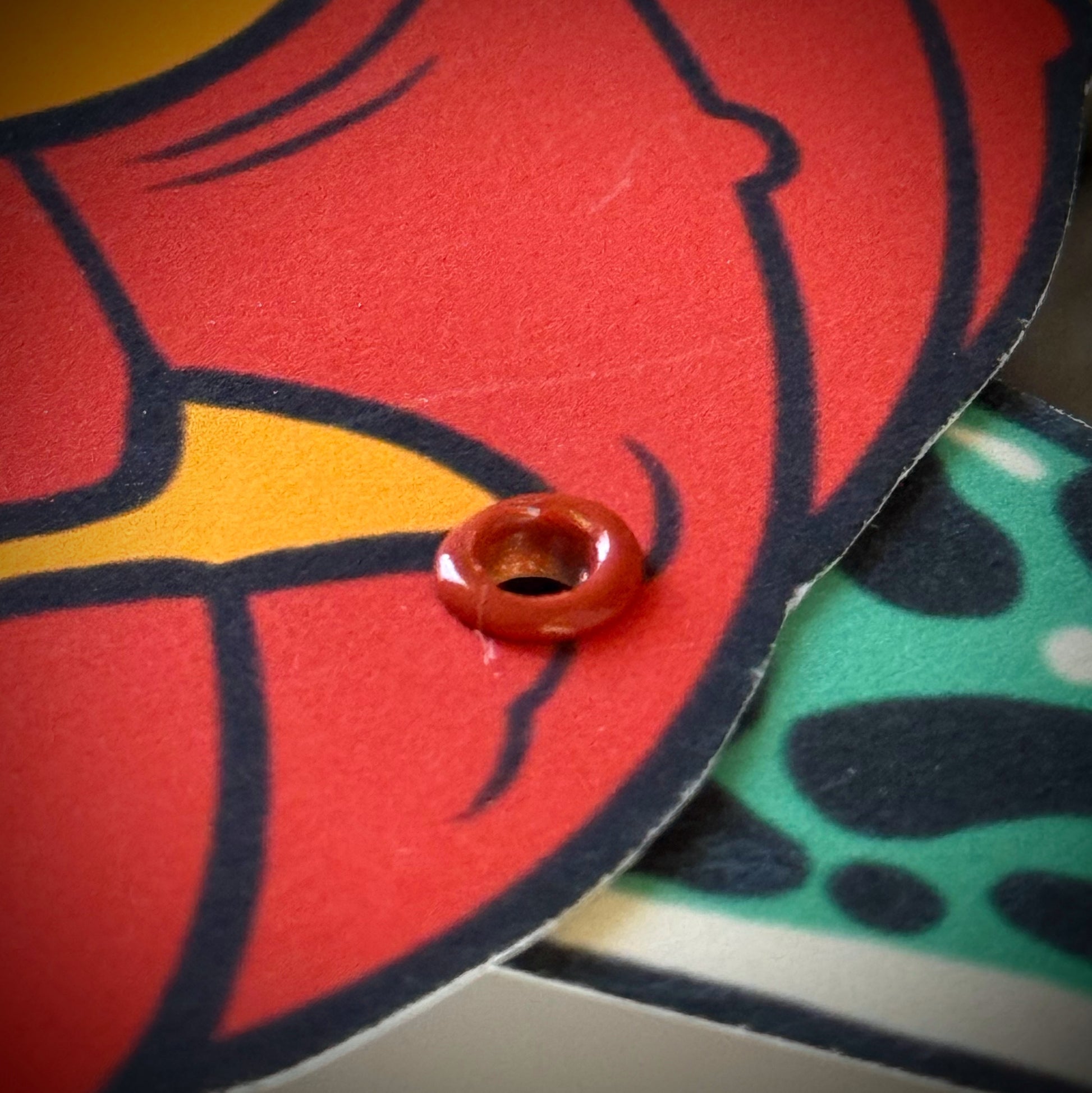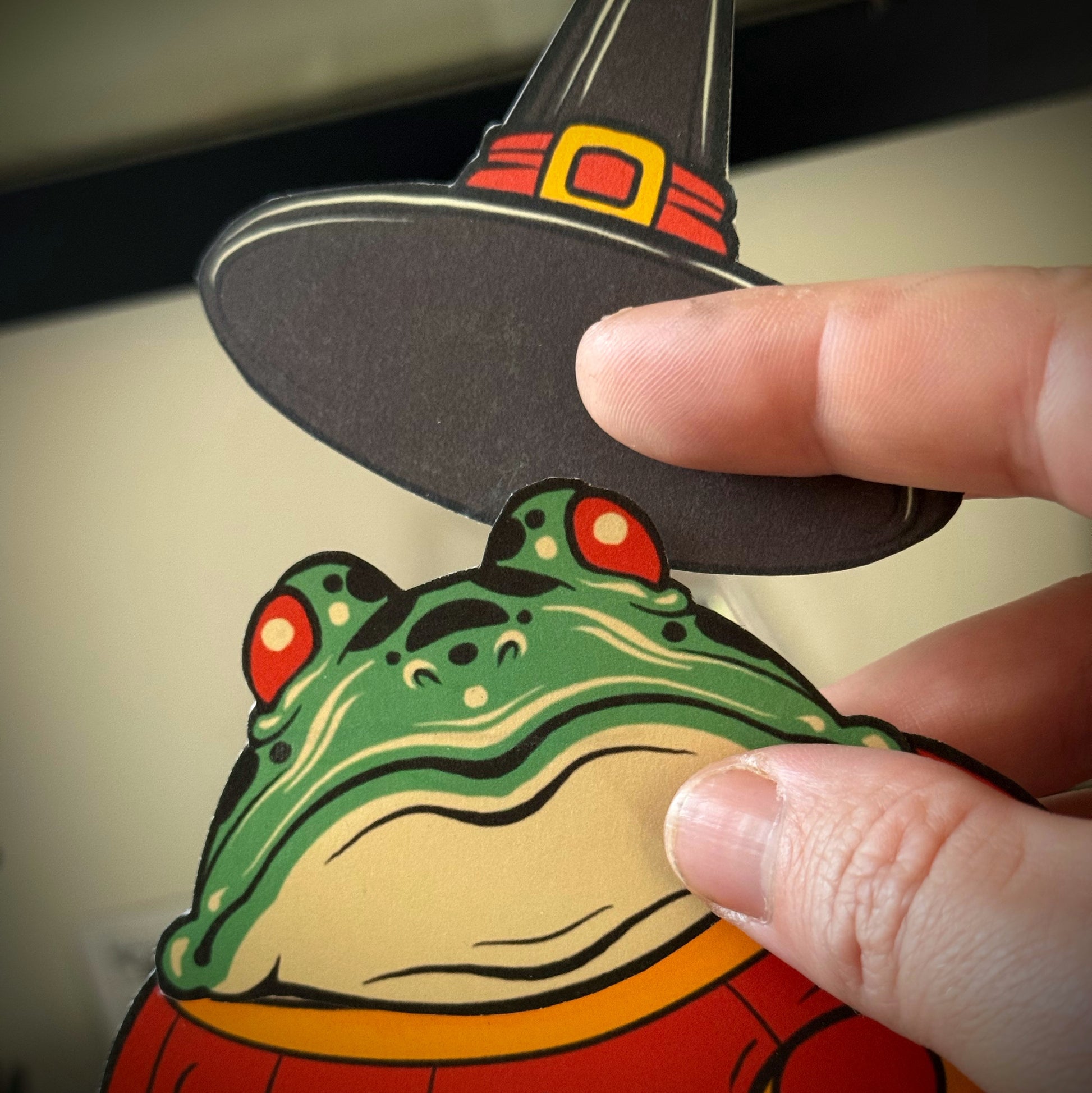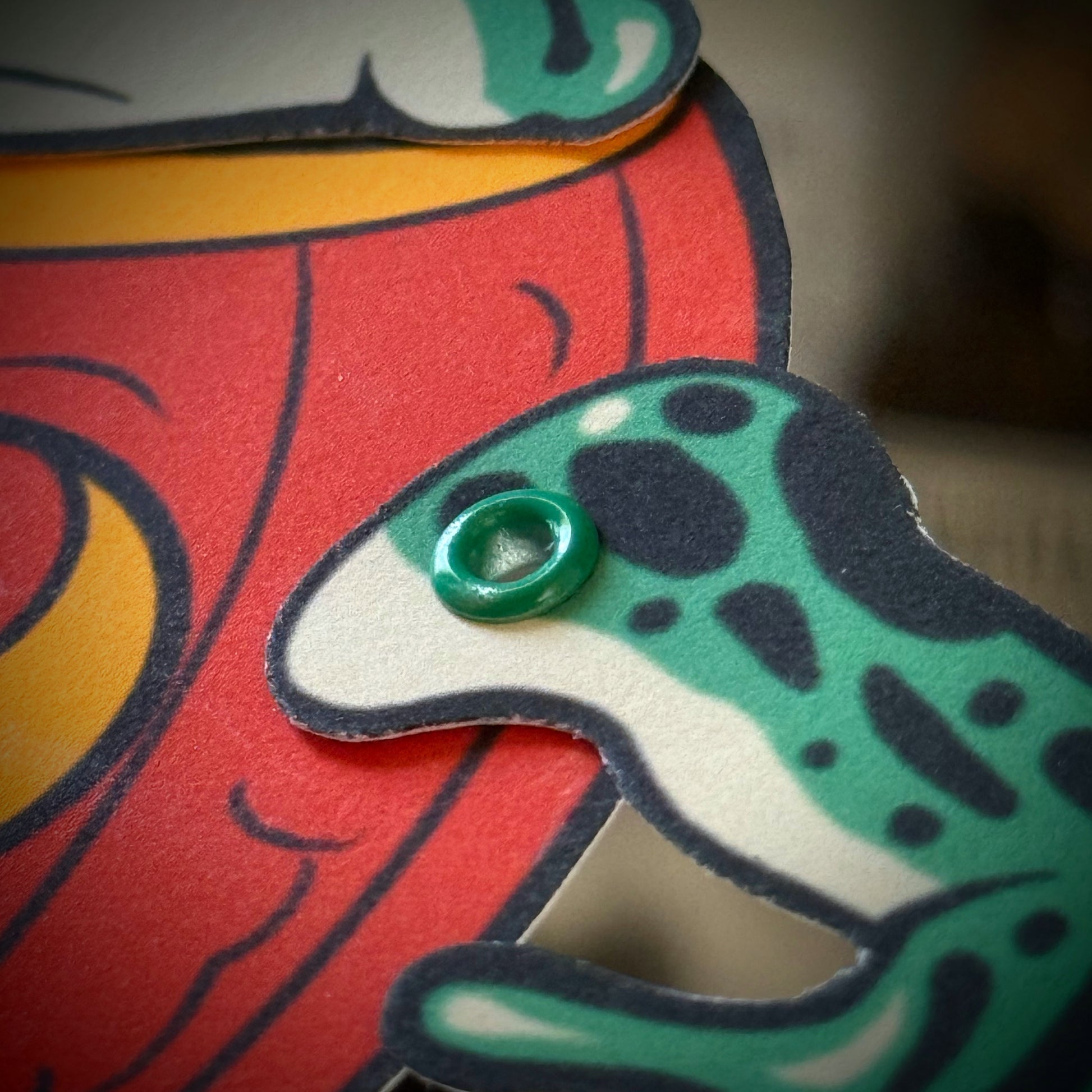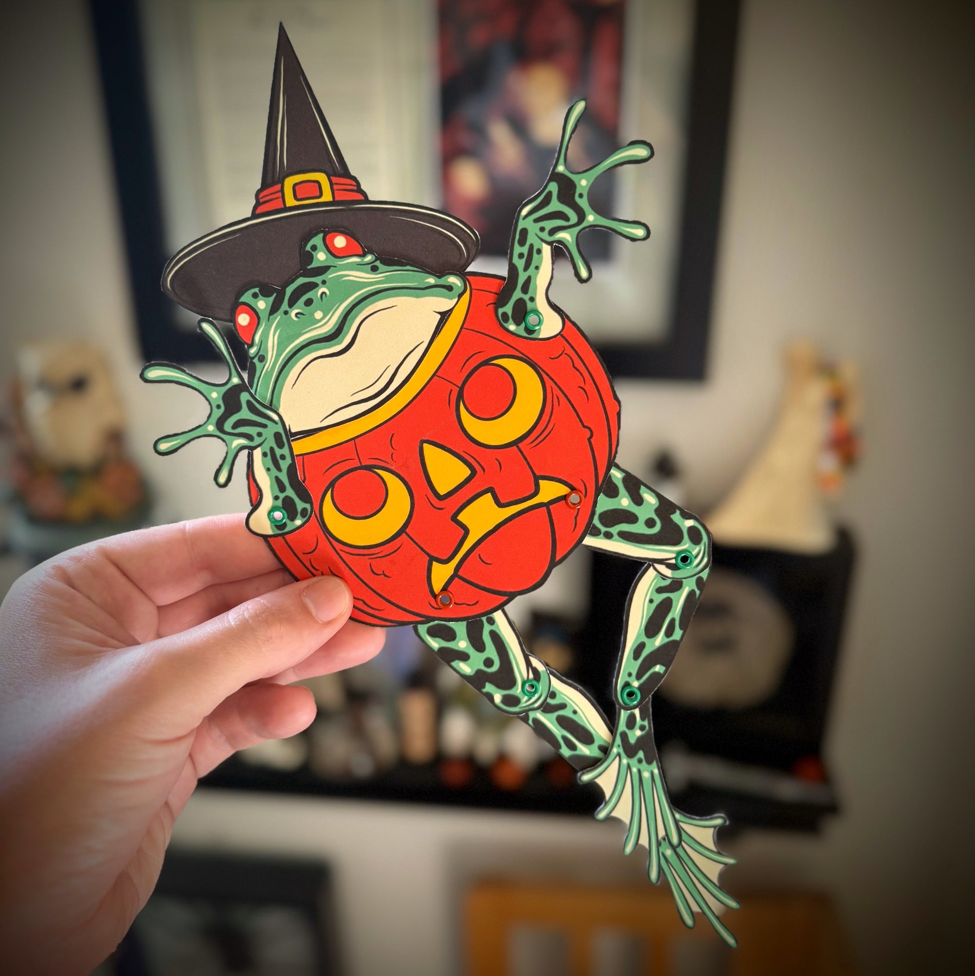 Let’s hop back in time to a Halloween adorned with paper die-cuts and dolls. Each ‘Lily P. Leaper’ is completely handmade from printing to cutting and assembly. No two are exactly alike. Printed on thick aurora art natural 300 matte paper and fastened together with metal eyelets, each frog has a removable/posable witch hat included.