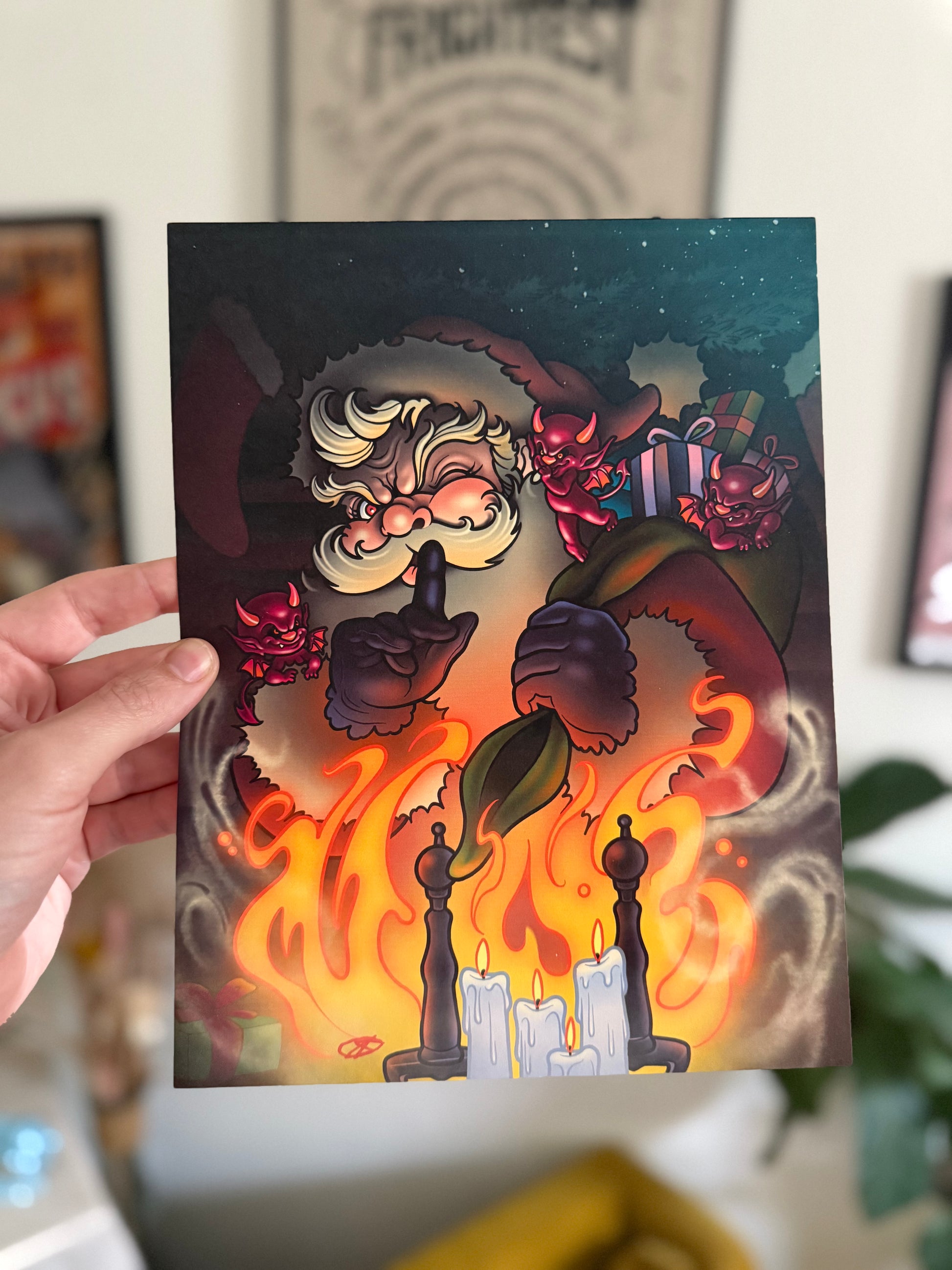 Add a sinister Santa and his devilish helpers to your holiday decor this year. Printed on 8.5x11” Aurora Natural Premium Matte paper. Comes signed and sealed.
